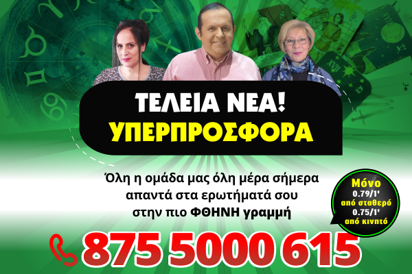 ΚΑΛΕΣΕ ΤΩΡΑ στο 875 5000 615 μόνο από 0,75/λεπτό και μίλα με τους ΕΜΠΕΙΡΟΤΑΤΟΥΣ ΜΕΛΛΟΝΤΟΛΟΓΟΥΣ του zwdia.gr. Μιλούν με ΑΠΟΔΕΙΞΕΙΣ ΚΑΙ ΟΝΟΜΑΤΑ!