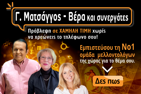 Μίλα με τον ΓΙΩΡΓΟ ΜΑΤΣΑΓΓΟ, τη ΒΕΡΑ και την υπόλοιπη ομάδα επαγγελματιών αστρολόγων και ταρωμαντών μας και μάθε τα ΣΥΓΚΛΟΝΙΣΤΙΚΑ που σε περιμένουν ΟΠΩΣ ΠΑΝΤΑ στην πιο ΦΘΗΝΗ ΤΙΜΗ χωρίς να χρεώνεις το τηλέφωνό σου με 5ψήφιο αριθμό!