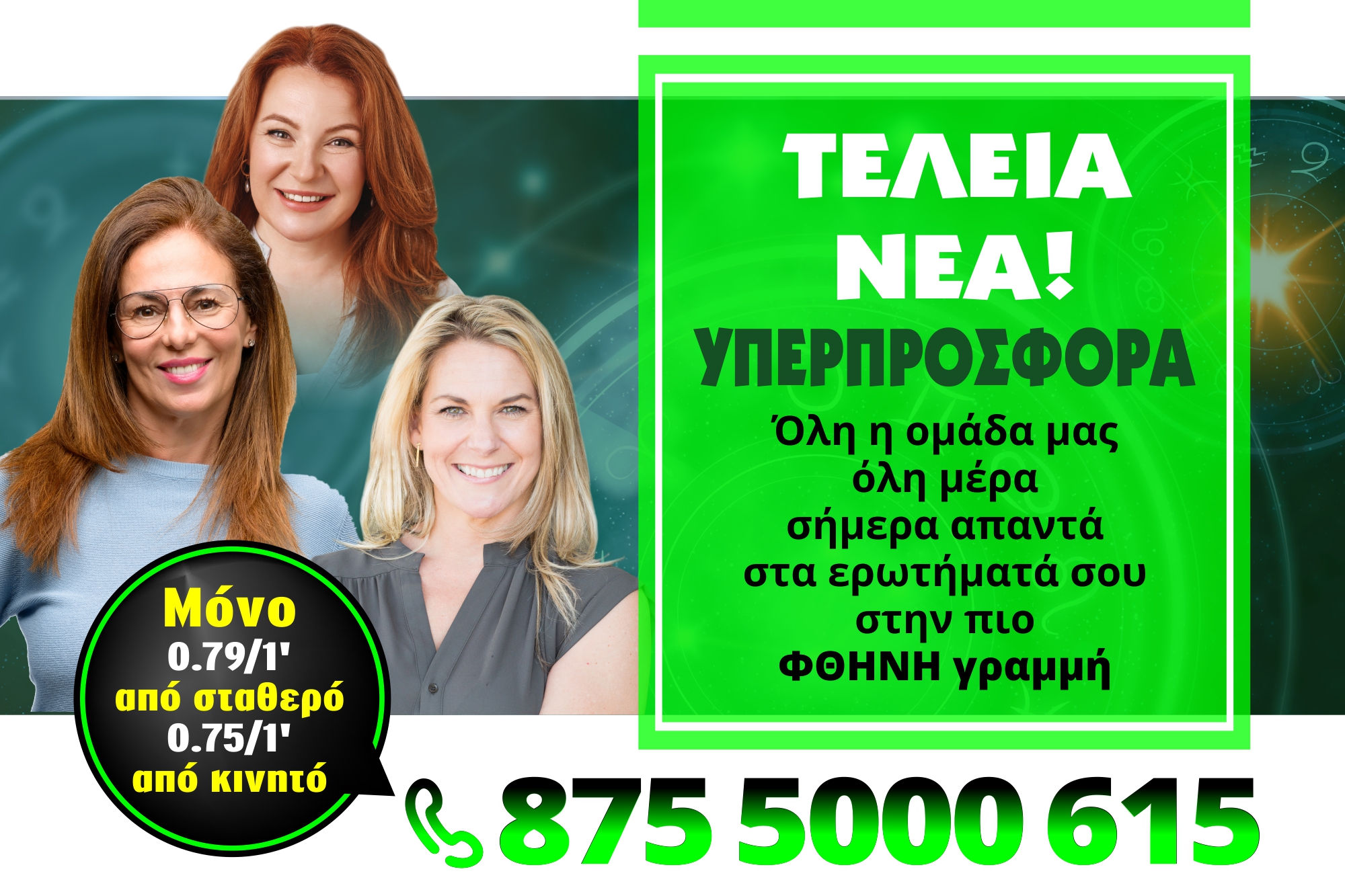 Όλη η έγκριτη ομάδα μας, η Αλεξάνδρα, η Ραφαέλα, η Ζέτα, η Ραμόνα, η Βανέσσα, η Ερμιόνη και οι εξαίρετοι συνεργάτες τους είναι σήμερα στην ΠΙΟ ΦΘΗΝΗ ΓΡΑΜΜΗ ΜΟΝΟ ΑΠΟ 0.75/1' για να απαντήσουν σε όλα τα ερωτήματα σου!