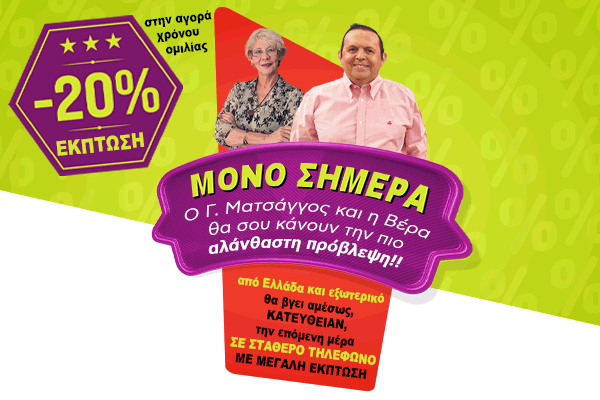 ΕΚΠΤΩΣΗ 20% στην πρόβλεψη ΜΕ ΑΓΟΡΑ ΧΡΟΝΟΥ ΟΜΙΛΙΑΣ και ΜΟΝΟ ΑΠΟ 0,72 €/1΄ ΜΟΝΟ ΓΙΑ ΣΗΜΕΡΑ ΓΙΑ ΕΛΛΑΔΑ ΚΑΙ ΕΞΩΤΕΡΙΚΟ!